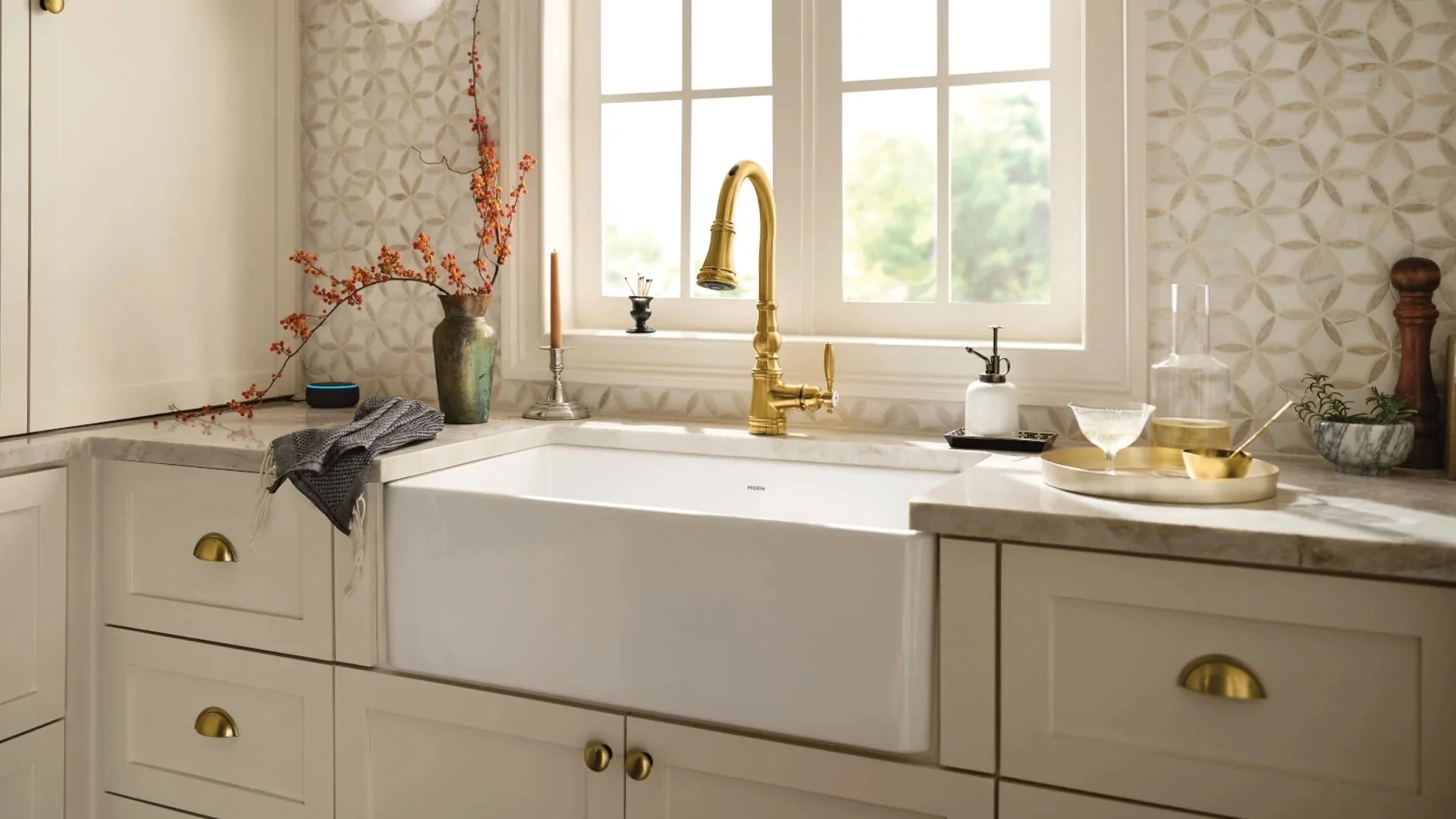 Modern kitchen with white marble countertops, a stainless steel faucet, and white cabinetry. A window with view of greenery outside and a vase with yellow flowers in the foreground.